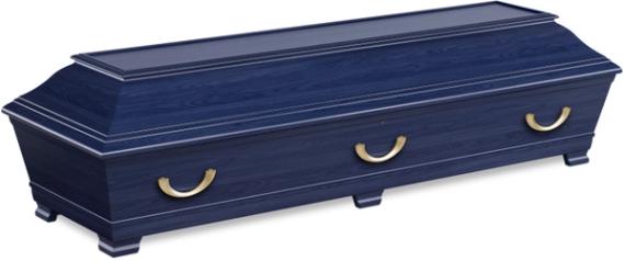 Blå kiste av spon og trefiberplate. Foliert. Denne modellen har 6 håndtak og 6 føtter.