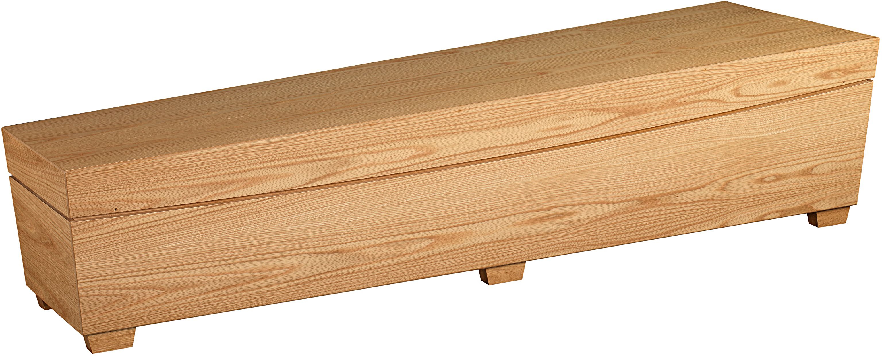 Konformet designkiste i eiketrefinert trefiberplate. Håndtak integrert i kistens sarg. Overflatebehandlet med miljøvennlig beis.