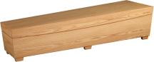 Løst, trukket lokk som skrues fast. Madrass, underlaken, slett teppe med overlakensflik og pute. Sidekledsel i tøy.