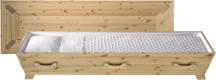 Tradisjonell kiste i klarlakkert furu med bunnplate av spon.